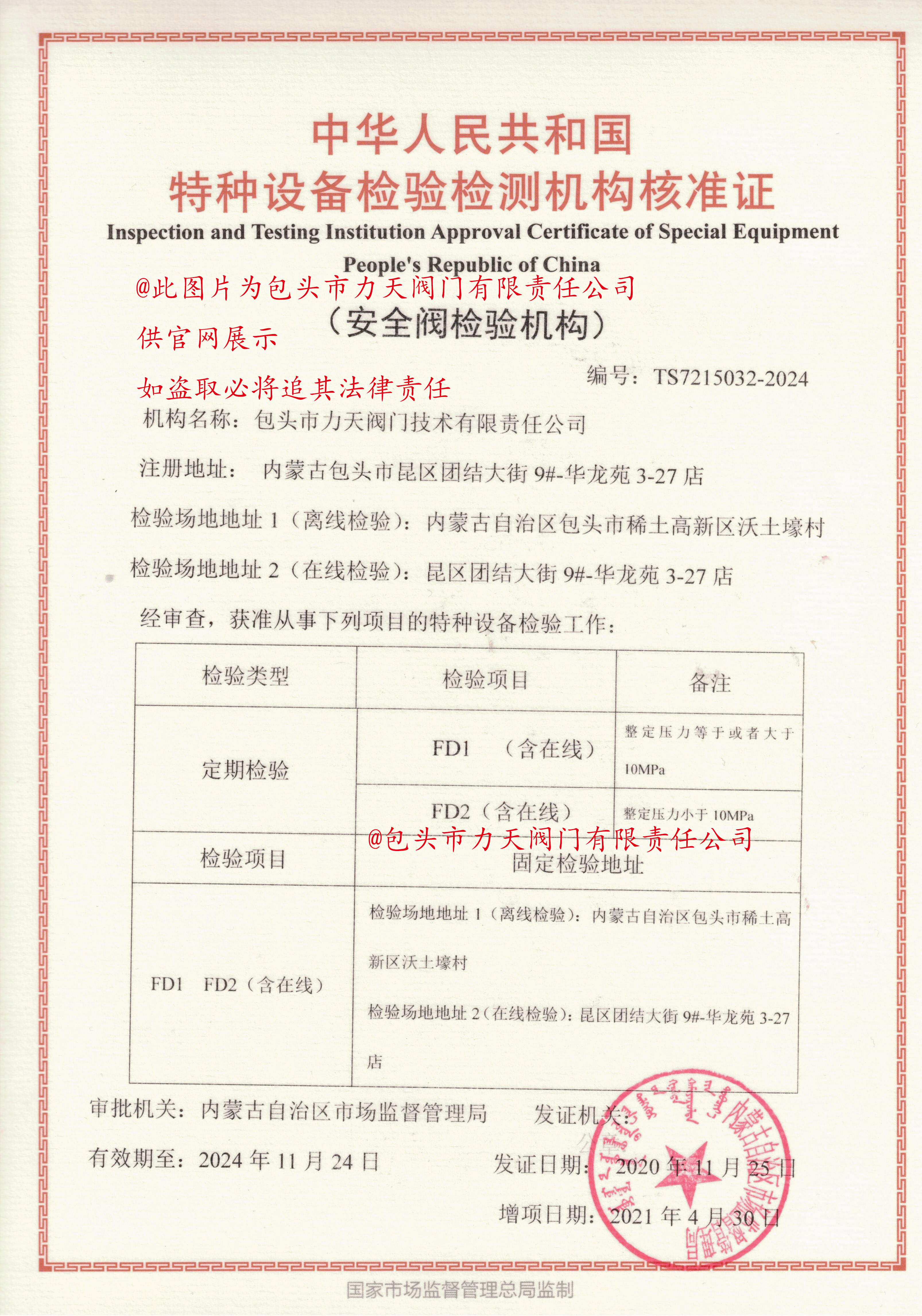 包头市力天阀门技术有限责任公司成立于2008年06月12日,前身是包头阀门总厂职工技术交流站,企业改制后,变更为股份制公司。我公司从1990年开始从事阀门现场检修效验.安全阀效验.维修及检测。公司总员工53人,其中工程师职称4人,管理人员5人,安全阀维修效验人员10人,其他技术人员15人,目前拥有一支以工程技术人员和工人技师为主的专业队伍,专为大型化工,电力,煤化工和石油等企业提供阀门现场检修效验服务,同时也承接离线检修效验,阀门的配件设计,十几年来获得全国用户的好评。