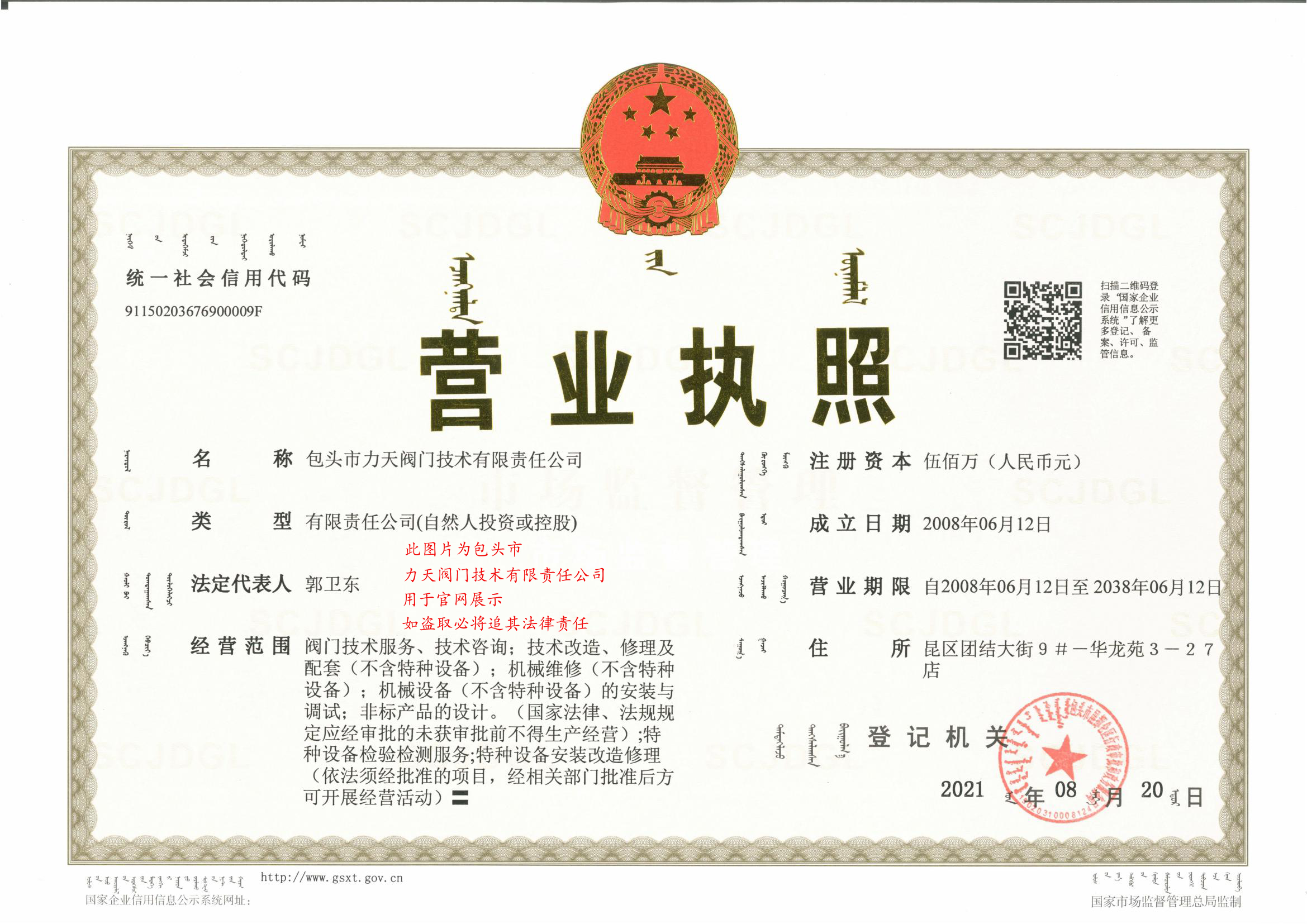 我公司注册资金500万主营业务有阀门技术服务,技术咨询,技术改造,修理及配套,机械维修,机械设备的安装与调试,非标产品的设计.阀门的检验及检测。